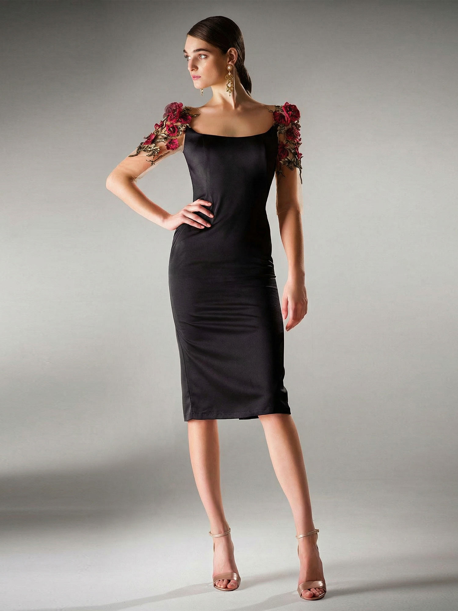 Make a statement in this stunning cocktail dress with floral sleeves, now featured in our Sample Sale in classic black with exquisite 3D red-and-green floral appliqués. The sleek, fitted silhouette highlights your curves, while the sheer embroidered sleeves add a couture, artistic touch.