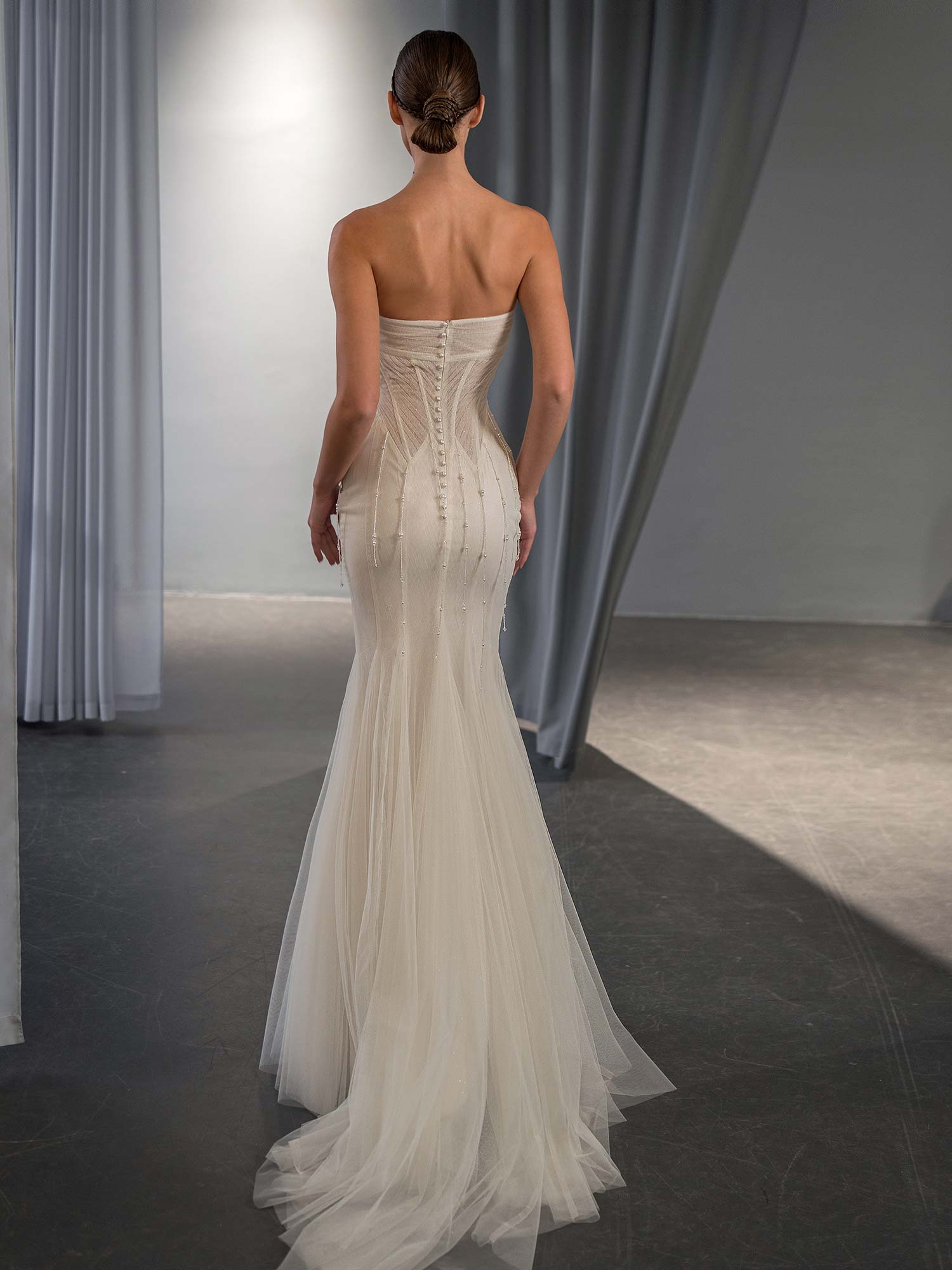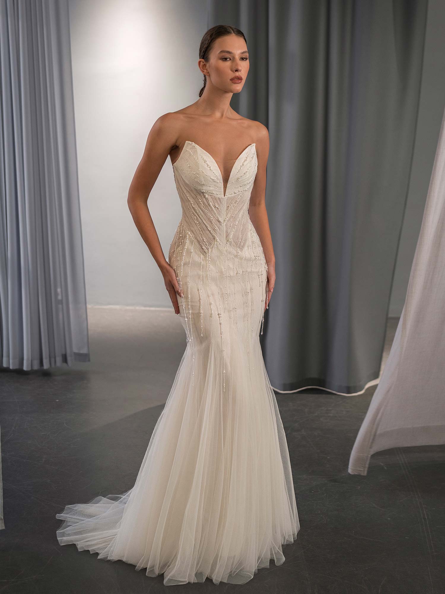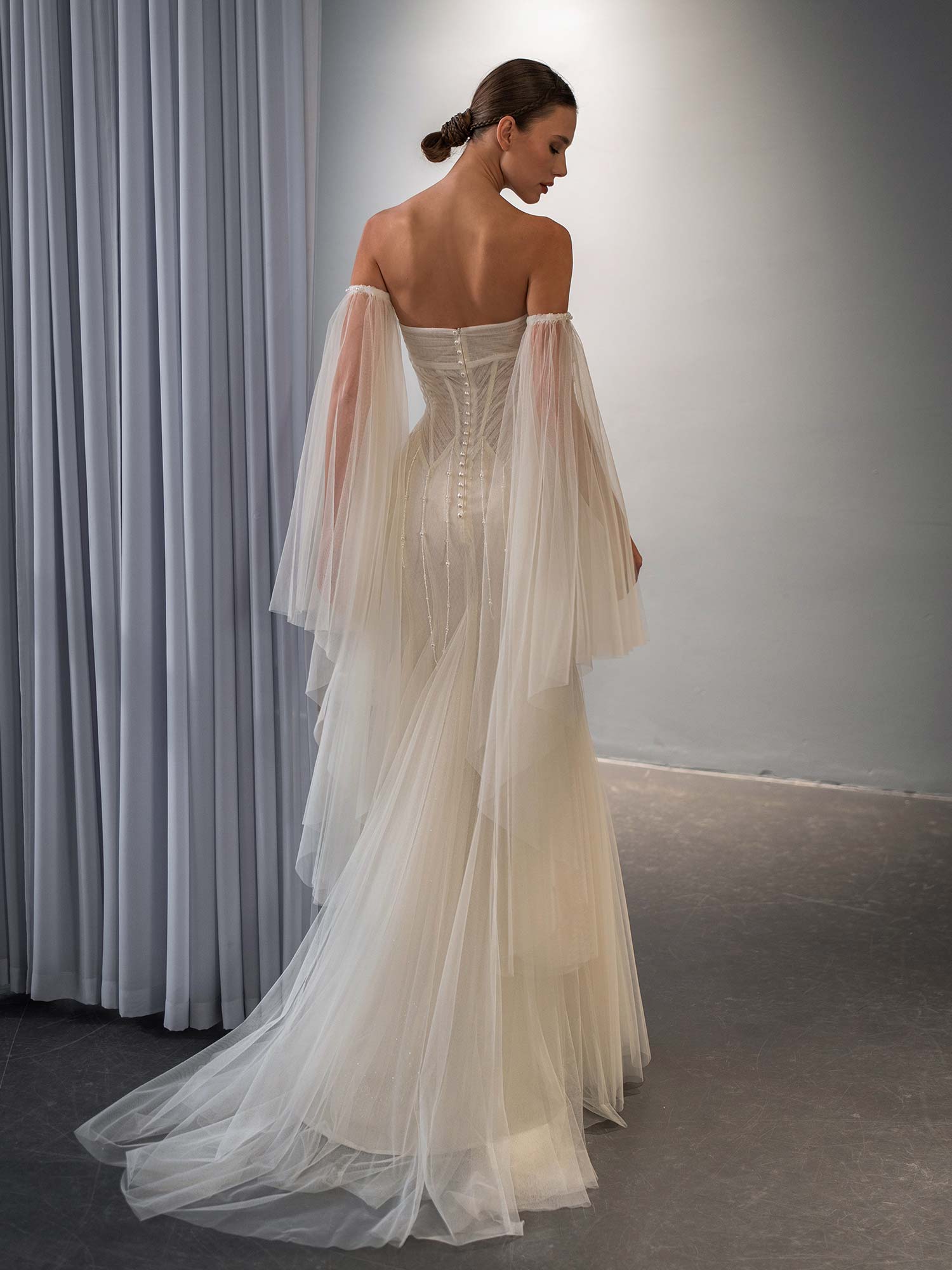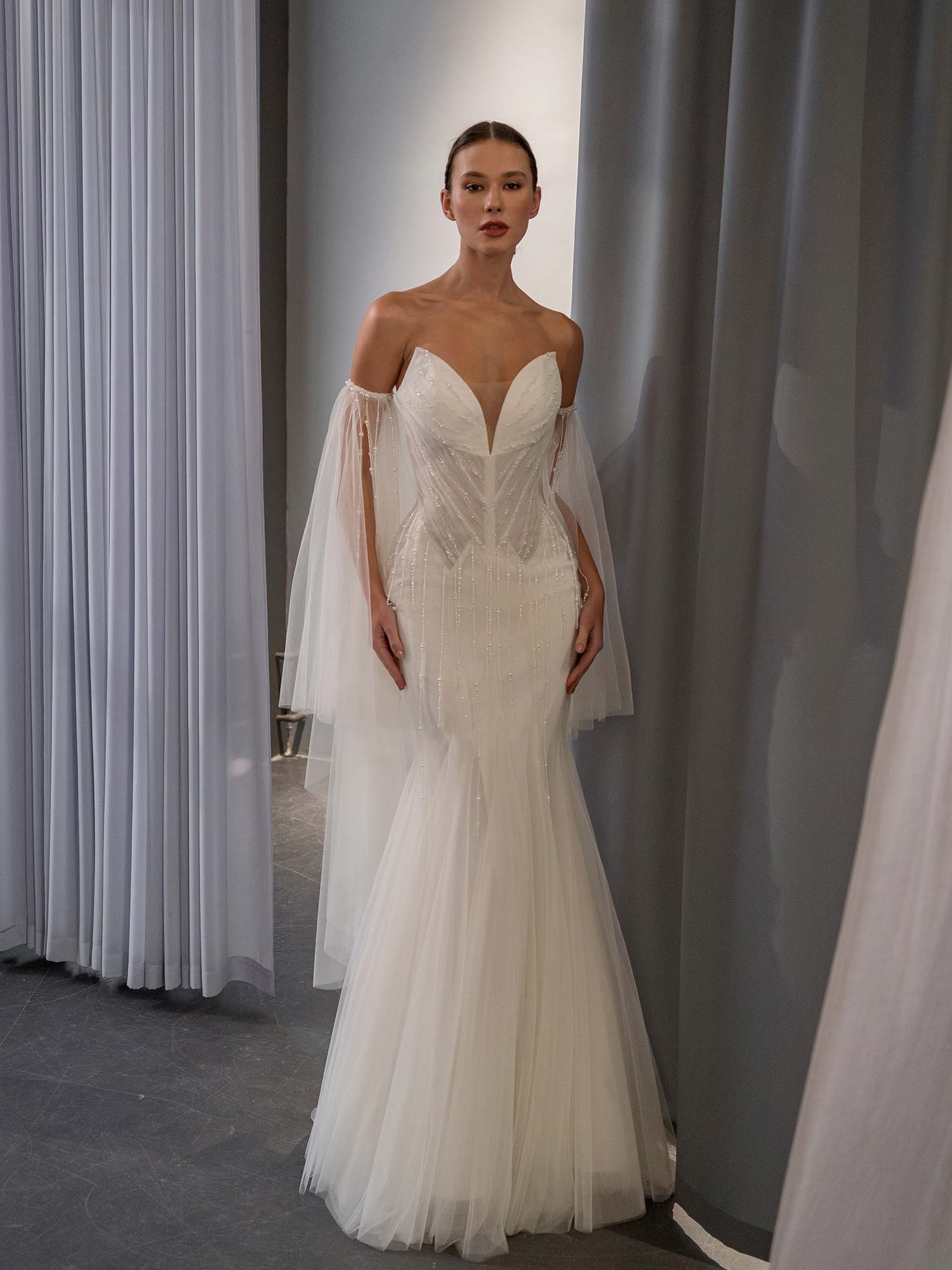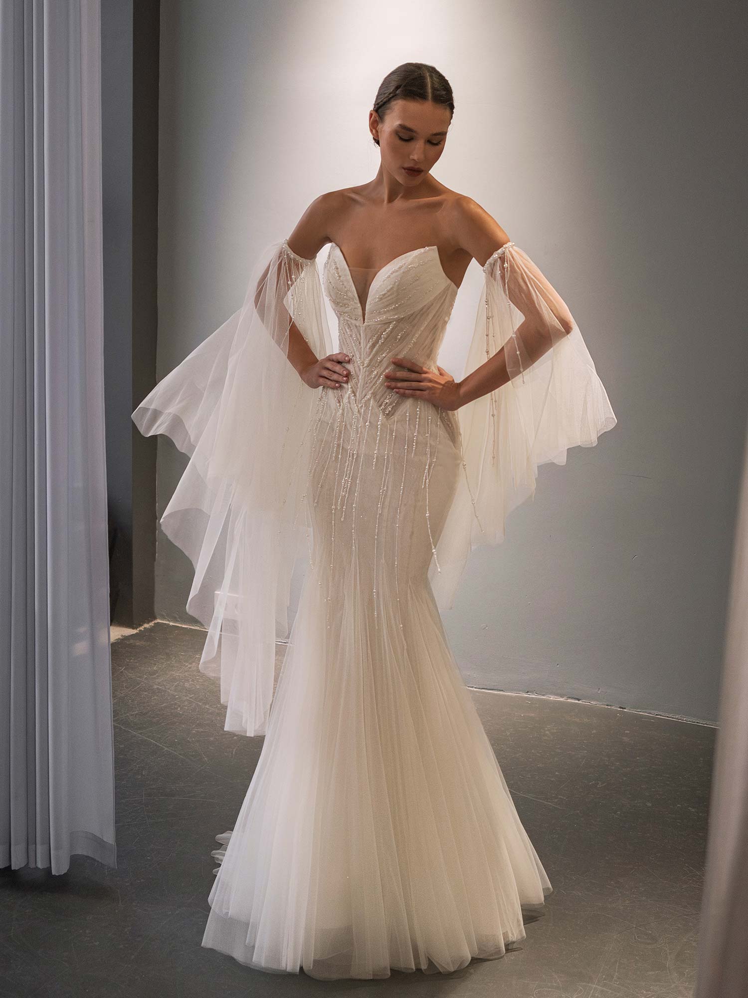 This fit and flare wedding dress blends modern glamour with ethereal detailing, creating a look that is both sculpted and effortlessly romantic. The semi-sheer bodice, which can be lined upon request, features delicate beading and structured boning for support and contouring. A soft shimmer layer beneath the tulle adds a luminous glow that catches the light with every movement. The detachable cape sleeves are the highlight of this style, draping gracefully from the arms to create an airy, dramatic effect that flows beautifully down the aisle. When removed, the gown transforms into a clean, strapless fit and flare silhouette — perfect for the reception or a second look. The skirt flares gently from the knee with layered tulle, adding lightness and volume without overwhelming the shape. This gown is ideal for brides seeking versatility, detail, and a romantic yet fashion-forward aesthetic.