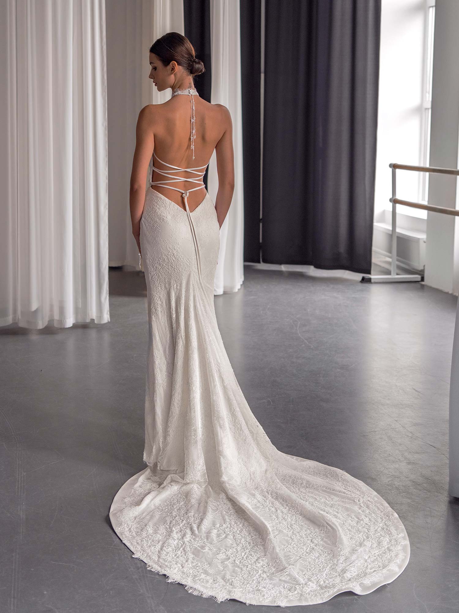 This lace halter neck wedding dress with open back is a sophisticated, high-fashion silhouette designed for brides who love a modern statement balanced with delicate detailing. The sculpted bodice features soft draping and elegant lace texture, complemented by a high halter neckline that wraps gracefully behind the neck. The dramatic open back is finished with intricate crisscross straps, creating a striking contrast to the refined front.